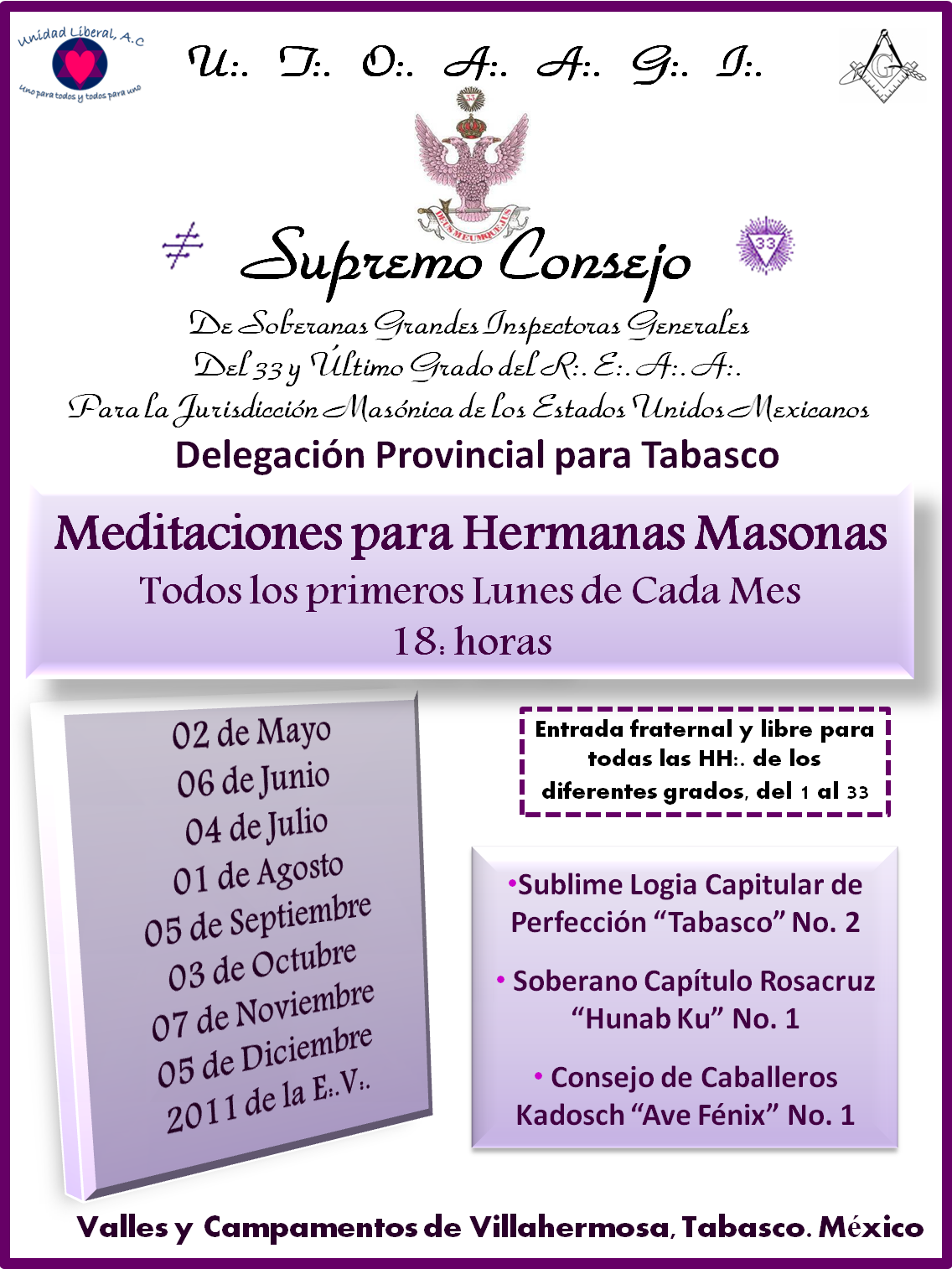 La Delegación Provincial de Tabasco del Supremo Consejo de Soberanas Grandes Inspectoras Generales del 33° y Último Grado del Rito Escocés Antiguo y Aceptado para la Jurisdicción Masónica de los Estados Unidos Mexicanos llevará a cabo Meditaciones Mensuales para Masonas, todos los primeros lunes de cada mes, a partir de mayo de 2011; estas meditaciones serán impartidas por las II:. y PP:. HH:. Masonas Activas integrantes del Supremo Consejo Femenino de México y de esta Delegación de Cuerpos Filosóficos Femeninos en Tabasco. Por lo que, todas las Respetadas, Queridas y Venerables Hermanas de la Gran Jurisdicción están fraternalmente invitadas para asistir y compartir la experiencia de Meditar a la Gloria del Gran Arquitecto del Universo.